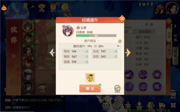 玩家除了通过提升装备来增强属性外,给伙伴喂食青丘白菜与神木佛跳墙以提升好感度,同样能为伙伴的基础属性带来一定加成。