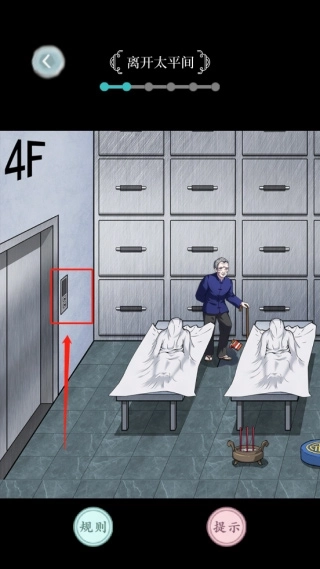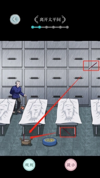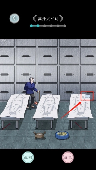 4、这时玩家可能会进入太平间,在这个场景里玩家可以点击图中绿色箭头指向的纸条