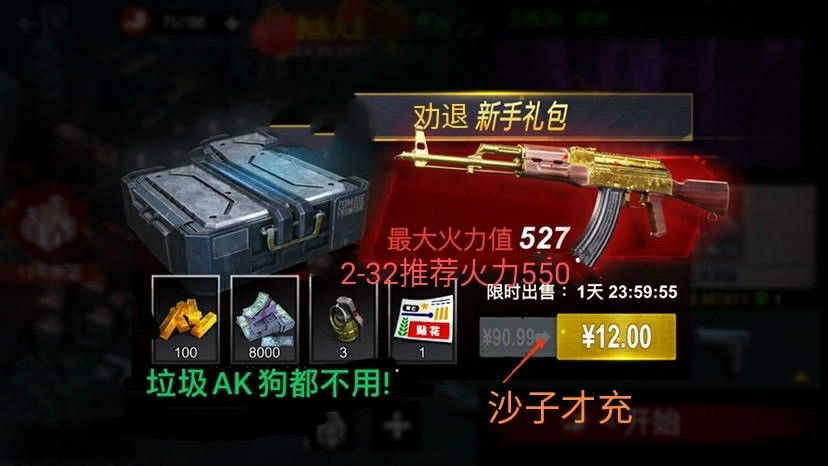 1、不建议新手购买ak礼包,1 - 2区跨区步枪存在大坑,这种坑在二区尤为明显,满改后火力仅有527,由此便能想见过关的难度。