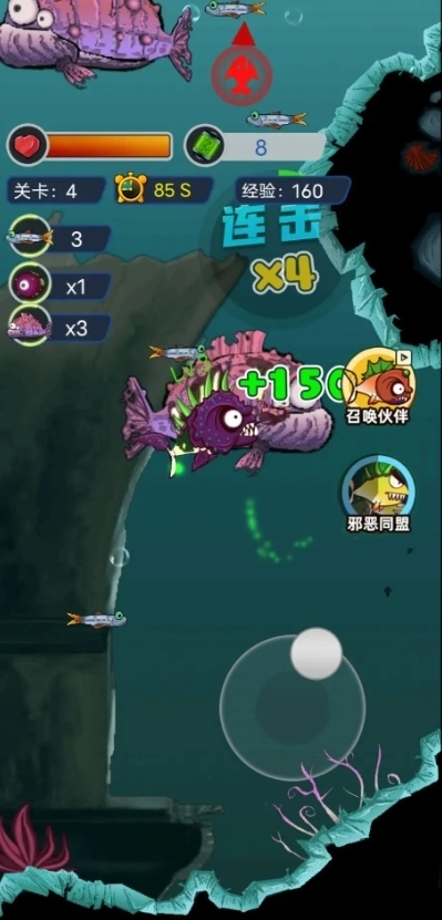 2、增添了不少丰富有趣的挑战玩法,需要快速找到比自己弱小的小鱼并将其吃掉。