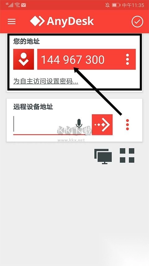 1、打开AnyDesk安卓版,在“远程设备地址”栏输入对方设备ID地址,选择“箭头”图标,