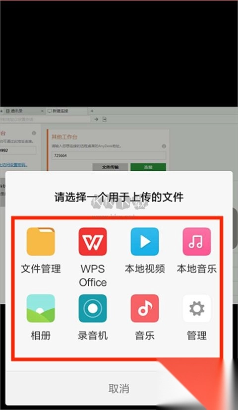 3、进入上传文件界面,包括“文件管理”、“本地视频”、“本地音乐”、“相册”、“录音机”、“音乐”等选项,选择需要的文件即可上传。