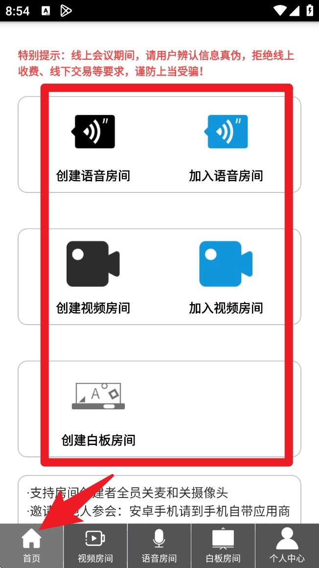 1. 进入首页后可选择「创建语音房间」「加入视频房间」等选项,快速开启或参与不同类型的会议空间。