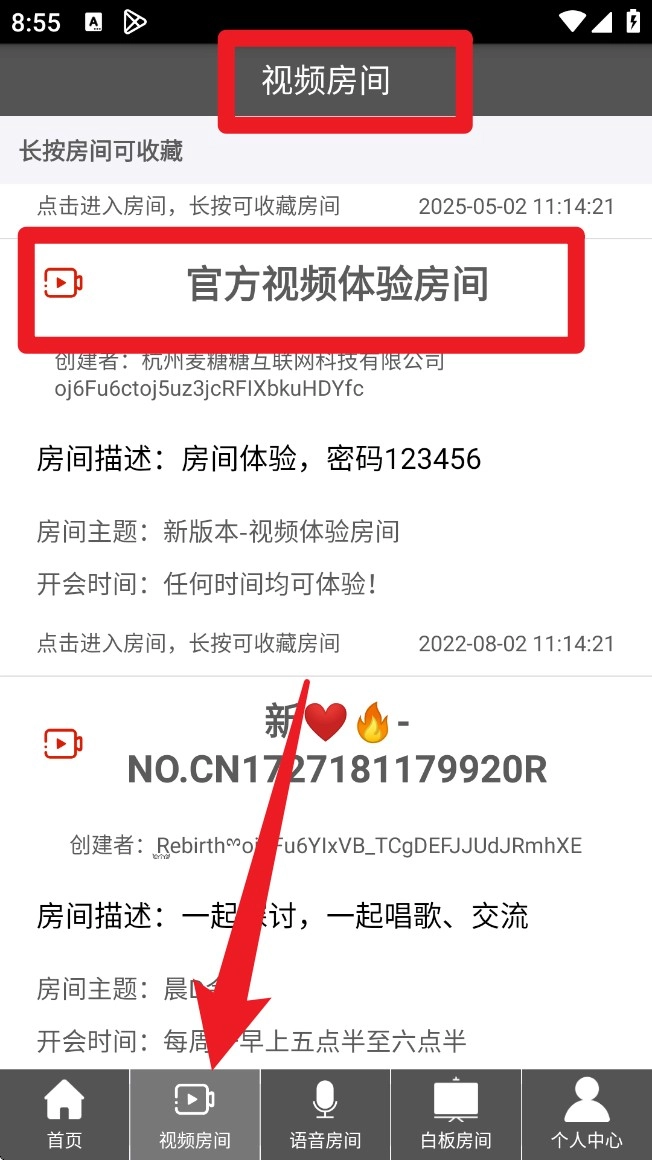 2. 切换到「视频房间」页签后,可浏览各类公开会议,点击进入即可参与或体验视频会议。