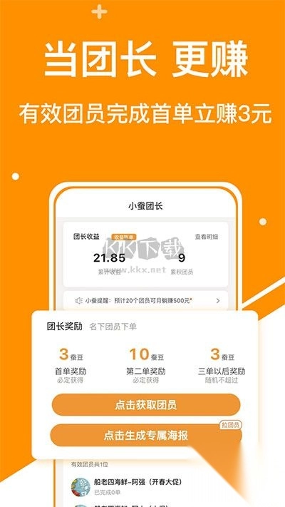 3、当团长更赚,名下团员完成2单,团长必赚13元。