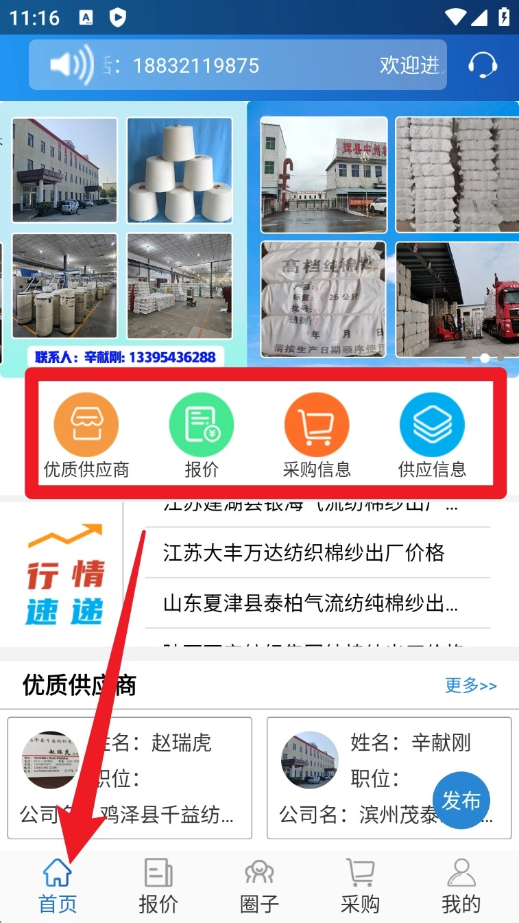 1. 打开 App 进入首页,可浏览纱线工厂、供应图集与联系方式,点击分类图标快速跳转到报价、采购等模块。