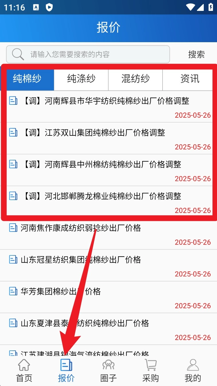 2. 切换至「报价」标签页,可查看纯棉纱、涤纶纱等多个品类的实时出厂价格,支持关键词搜索与分类筛选。