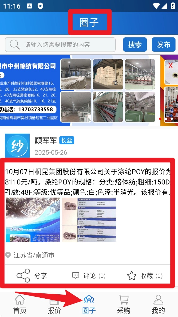 3. 点击底部导航栏「圈子」,浏览行业发布内容与行情评论,也可以发布图文,和其他商家互动交流。
