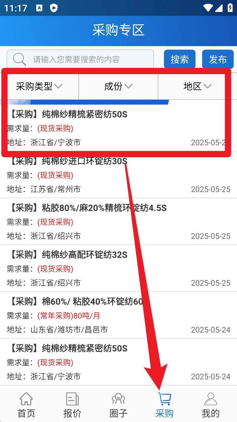 4. 进入「采购专区」即可查看各地采购需求,可根据地区、成分、品类进行筛选,还能直接发布求购信息。
