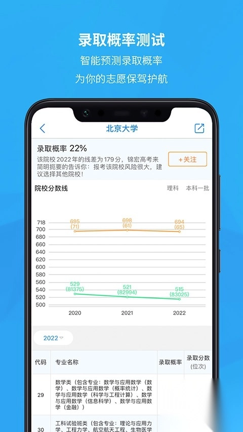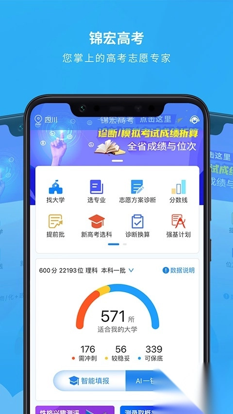 锦宏高考志愿填报APP,是一款为考生量身打造的高考志愿填报辅助系统,专门服务于高考学子。在这个平台上,学生能够在线查询全国各高校的录取信息,以及农学、医学、教育、经济、管理、法学等众多专业的报考要求。不仅如此,该软件具备智能选志愿功能,用户只要输入分数或排名,就能获取稳、冲、保三个不同层次的志愿参考方案。软件为广大考生汇集了全国2000多所高校的录取数据,以及院校和专业介绍信息,方便考生浏览,考生可依据自身能力挑选适合的学校进行志愿填报。同时,锦宏高考志愿填报软件吸引了各大院校老师入驻,考生可向他们询问各类相关问题,从而获得有效的大学志愿选择建议,提高录取几率。对于应届高考生,软件更是手把手教你填出满分志愿!倘若你正为高考承受着巨大压力,担心因过度紧张而发挥失常,亦或是想提前预估自己的大致考试水平,那就快来锦宏高考志愿填报APP吧,它将帮你打消当下的顾虑,让你的高考之路更加顺遂。