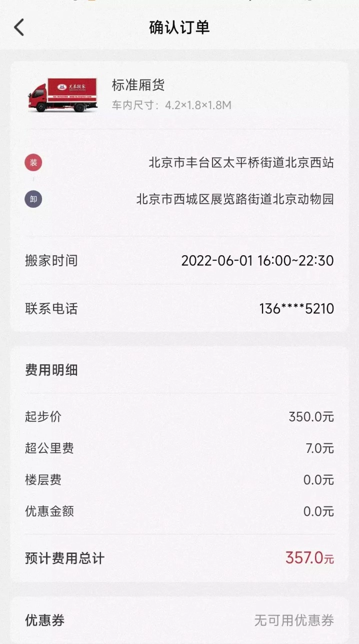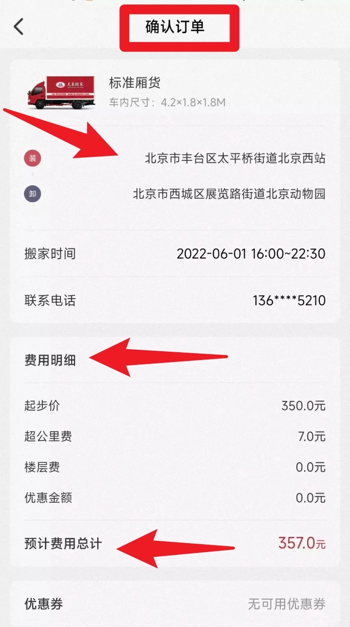 1. 在“确认订单”页面填写搬家起点与终点地址,确认车辆尺寸与搬家时间后可查看费用明细与总价。