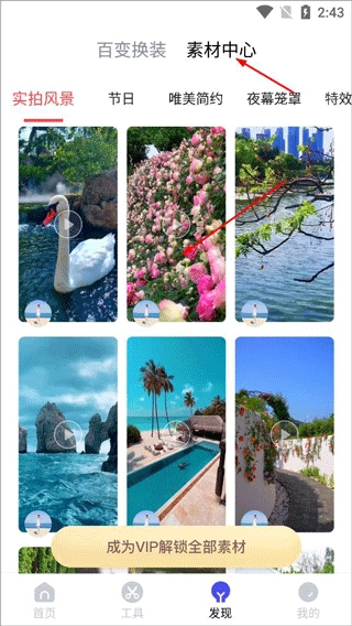 3、发现页面主要是素材中心和百变换装,可以下载素材添加到自己的视频中;