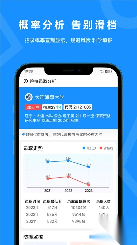 3、结合高考成绩和院校历年录取数据、高校录取难易度排行,帮助考生提前预测院校录取概率,控制落榜风险