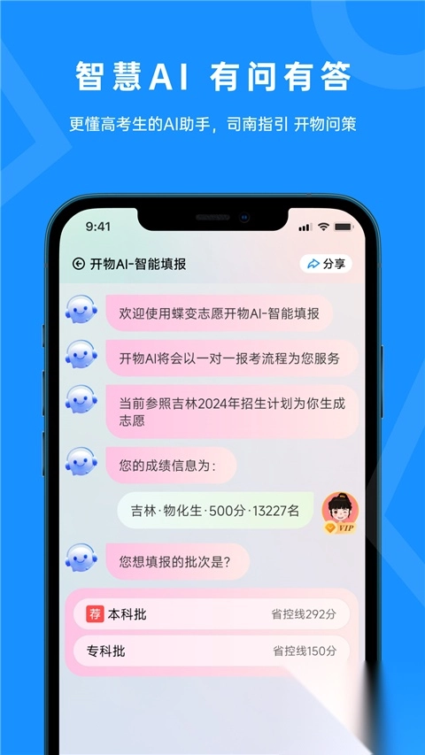 6、更多精彩功能,期待您来体验:可查询能报考的大学,参与院校对比(院校pk),进行志愿评估,避免撞车风险(防撞车),通过兴趣性格测试推荐专业或职业,观看小蝶讲志愿,分析高需求职业,快速筛选职业或专业,解析就业前景,统计高薪职业与专业,剖析热招专业。