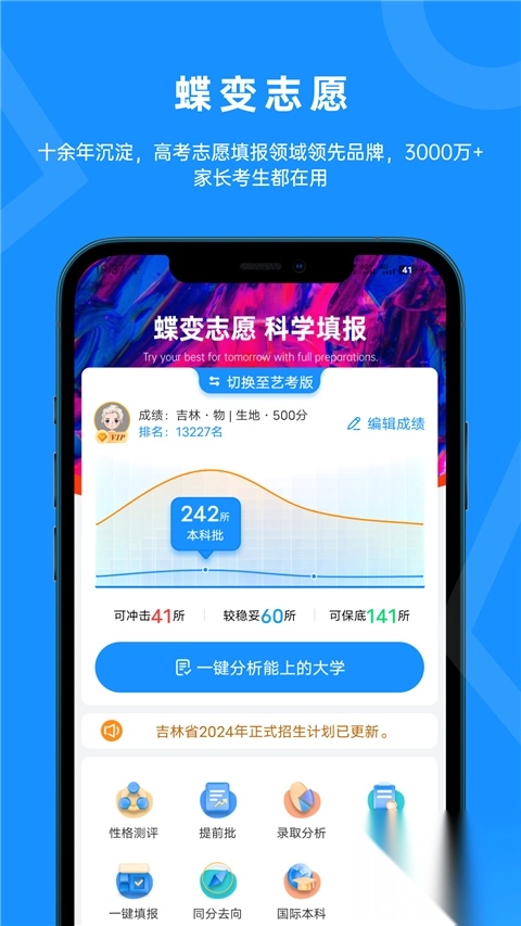 志愿填报是高考后重要的环节,志愿填的好,高考赢得早,许多考生在志愿填报上遇到难点,由于对院校、对专业不了解,而做出影响一生的决定。蝶变志愿累计为全国800多万考生提供专业的志愿填报服务,是考生家长认可的志愿填报平台。让考生在填报志愿中一键匹配理想大学,软件中的独家院校推荐算法更是获得无数好评,让考生在高考后能够轻松精准填报志愿,步入理想院校。预祝各位高考学子金榜题名,考上自己理想的学校。