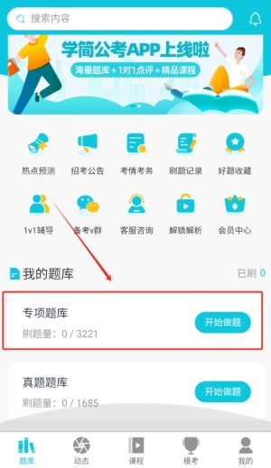 学简公考app为考公人群打造一站式备考服务体系,凭借海量题库搭配专业课程,助力考生在备考阶段做足准备,提高上岸几率。