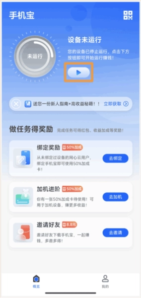 1、于本站免费下载并安装手机版app,随后在APP首页,点击【赚钱开关】即可运行设备。