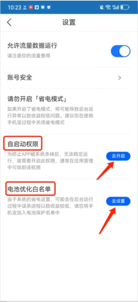 【我的】-【设置】-【自启动】和【电池优化白名单】,查看是否开启这2个权限的配置。若未打开,请按照指引开启。