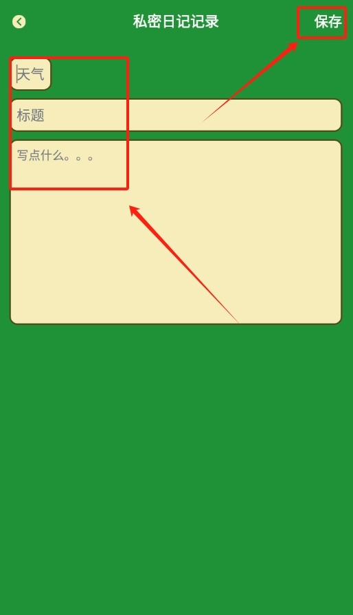 3、填写当天天气、日记标题,写下内容,检查无误后,点击右上角 “保存” 就完成了。