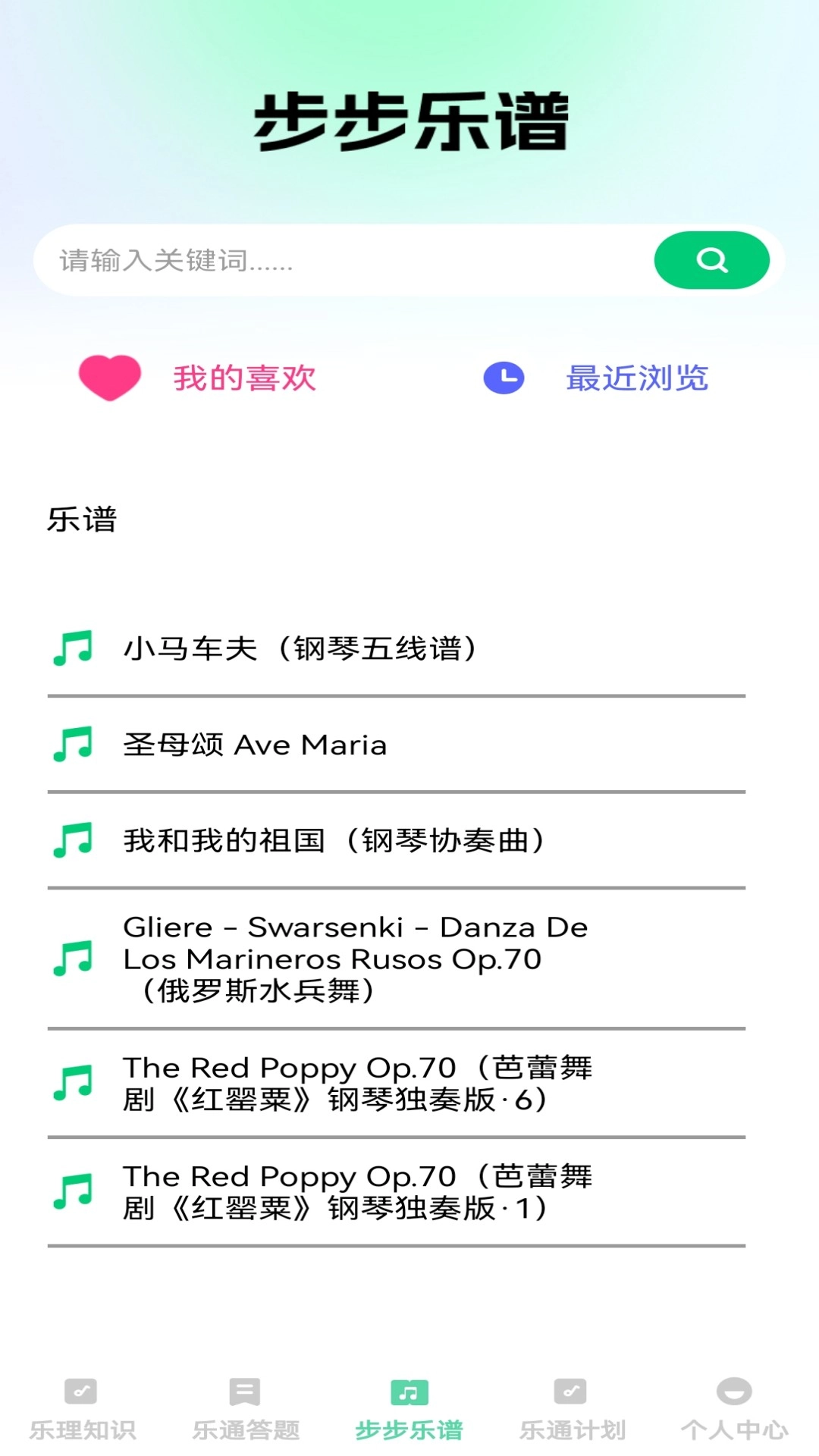 2、乐谱资源服务:包含海量乐谱库,支持关键词搜索、收藏喜欢的乐谱,同时可对个人乐谱库进行管理。