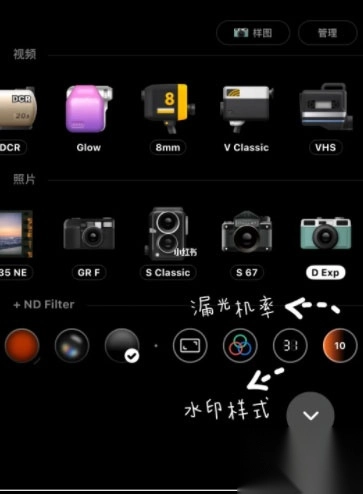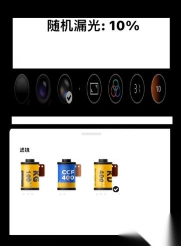 - 第三行内容包含:特殊镜头、胶片滤镜、比例以及漏光机率。