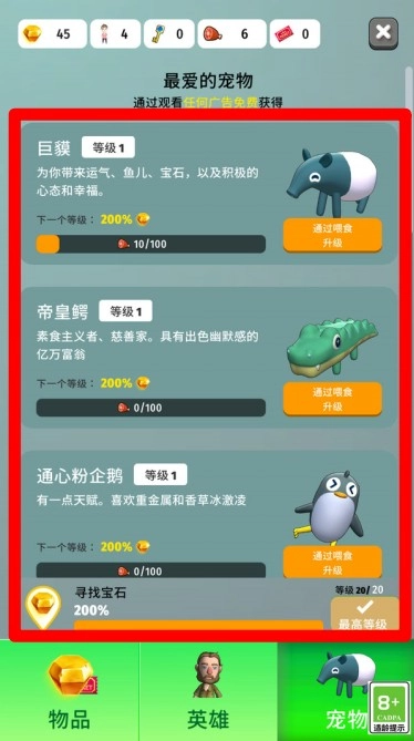 1.宠物界面可查看当前拥有的宠物,每只宠物具备不同加成,能提升金币获取效率与游戏节奏。
