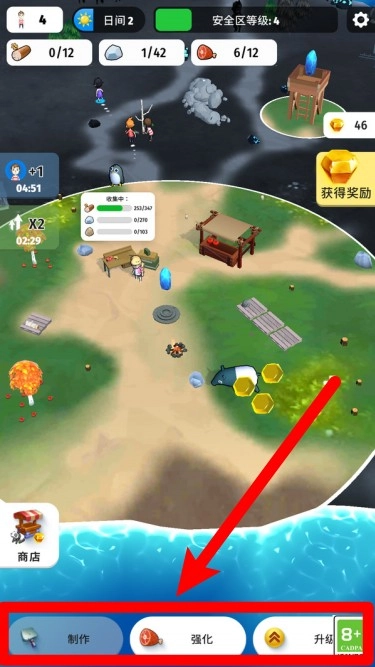 3.资源栏显示当前木材、冰块与肉类库存,用于制作、强化与建造,是推进发展的基础保障。