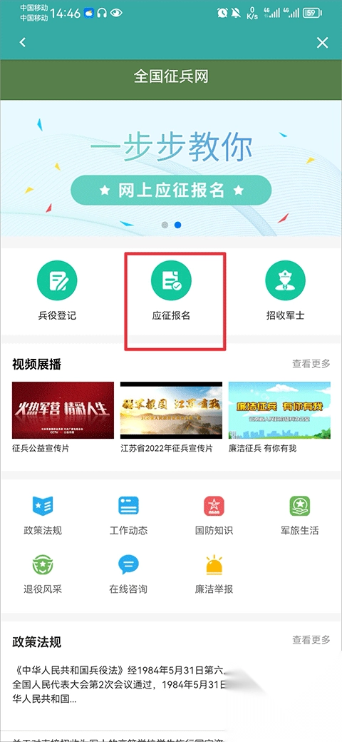4、打开后,点击“一步步教你网上报名”,随后便进入全国征兵网界面,再点击“应征报名”。