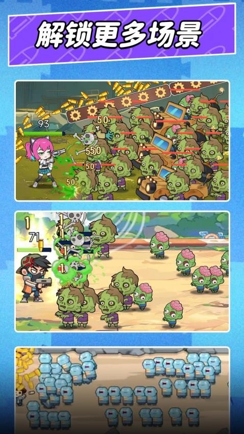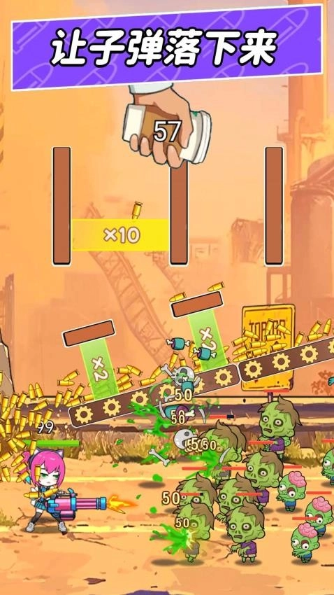 子弹落下便能打击僵尸,操控子弹向下掉落击中它们。僵尸会不断增多,必须持续调整角度射击,要是漏掉太多可就糟了。玩到后续会解锁新玩法,难度也随之提升。最为关键的是要节省子弹,看准时机再发射。天空偶尔会飘过加速带,抓住机会能让子弹威力更强。这游戏玩起来有点策略性,不能盲目乱射。喜欢动脑筋打僵尸的朋友可以尝试一下,单手就能操作,在坐车或者等人的时候玩很合适。