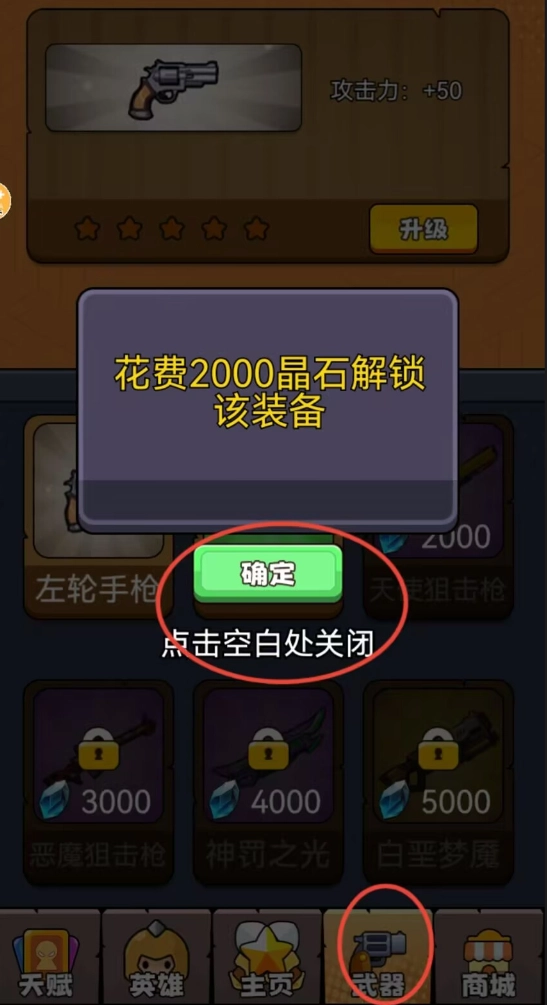 1、通过主界面武器选项进入商城,选择所需装备后消耗晶石完成购买即可解锁新武器。