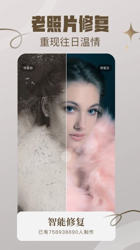 画质修复管家手机版可免费下载安装,这是一款极为全能的画质修复工具。它功能丰富多样,不仅能修复老照片,让你重拾往昔回忆,还能对照片中的人像进行美容,精细雕琢五官,添加各类精美妆容特效。此外,它还能使模糊照片变得清晰,是一款十分值得下载的软件。