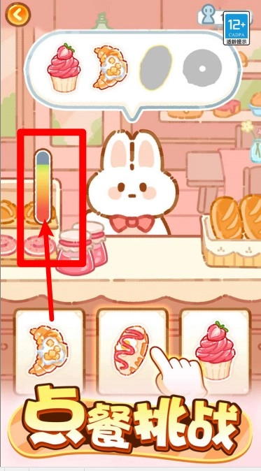 2.点餐挑战中左侧能量条会根据顾客满意度变化,连续点中正确甜点可快速提升进度并获得高分评价。