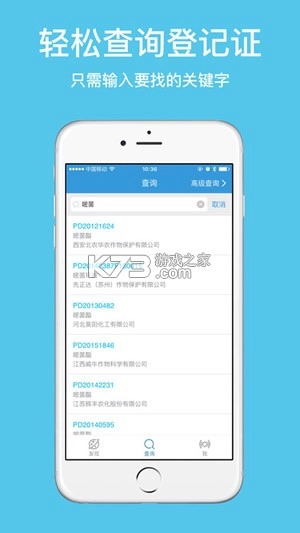 农查查免费提供农药登记证查询、肥料登记证查询、种子审定号查询、农资企业查询、产品实验效果查看以及样品试用申请等服务。用户认领企业后,可对公司登记的产品上传示范展示报告,同样也能开通产品试用的增值服务,开通后,用户便可在线向企业申请样品。其功能一目了然:农药登记证查询、品种审定号查询、肥料登记证查询、查看实验示范、申请企业样品。感兴趣的朋友快来体验吧!农查查app特色