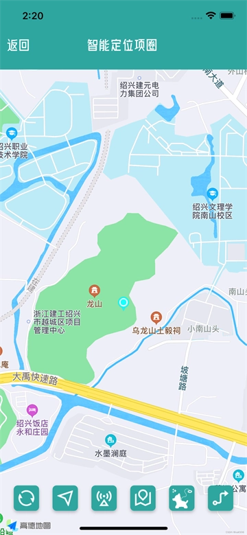 3. 点击智能项圈,即可进入项圈定位页面,地图上会显示手机和狗狗当前所在位置。下方的六个按键功能分别为:刷新定位、导航到狗狗当前位置,雷达寻宠,电子围栏,电子牵引,历史轨迹。