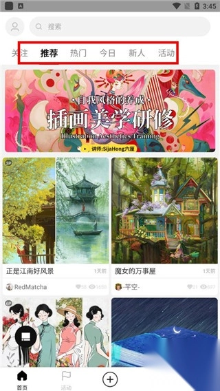 2、进入软件后,在首页,可以看到一共分为关注、推荐、热门、今日、新人、活动等多个板块;