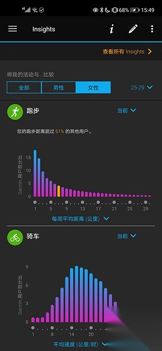 Garmin Connect以易于查看的形式展示您关键的健康数据及各项条目。您能够自行设定想要查看的内容及其排列顺序。同时,您还会获得更为详尽的分析。在此,您可以查看周度、月度和年度健康统计信息的平均值,您钟爱的活动的追踪历史记录,以及更多相关信息。