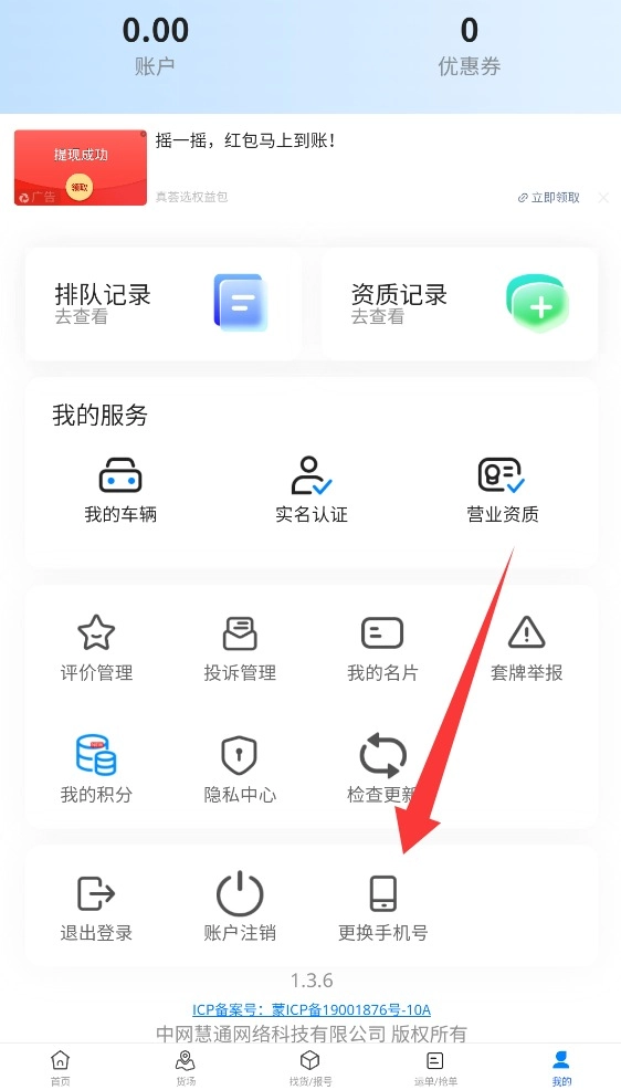 1、打开APP进入个人中心页面,滑动屏幕至最下方找到"更换手机号"功能入口。