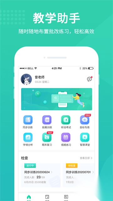 支持教师随时随地布置、检查作业和考试,系统自动批改出结果、一键奖评。最大限度释放教师精力,通过手机轻松提高教学效率。