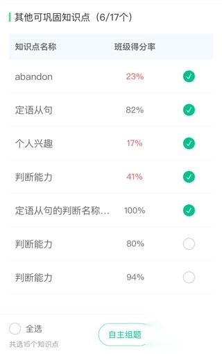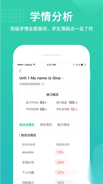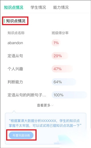 知识点情况:可以清晰便捷地看到学生薄弱知识点及得分率,并支持薄弱知识点的复习巩固;