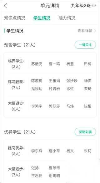 学生状况:涵盖预警学生与优异学生。每次练习后,各层次学生的情况清晰呈现,方便教师后续开展更具针对性的指导,还能一键关注成绩相对薄弱的学生。