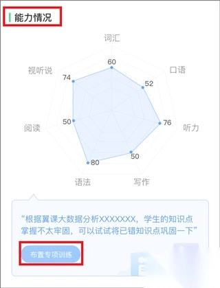 能力情况:根据学生的练习情况,用雷达图清晰展示学生对应的词汇、语法、听力、口语、阅读、写作、视听说能力得分,并可以进行针对性巩固练习,点击布置专项训练,可跳转到同步训练布置页面。