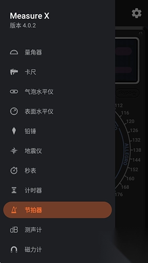 6. 在节拍器界面里,点击左上角的菜单,就能看到全部菜单。