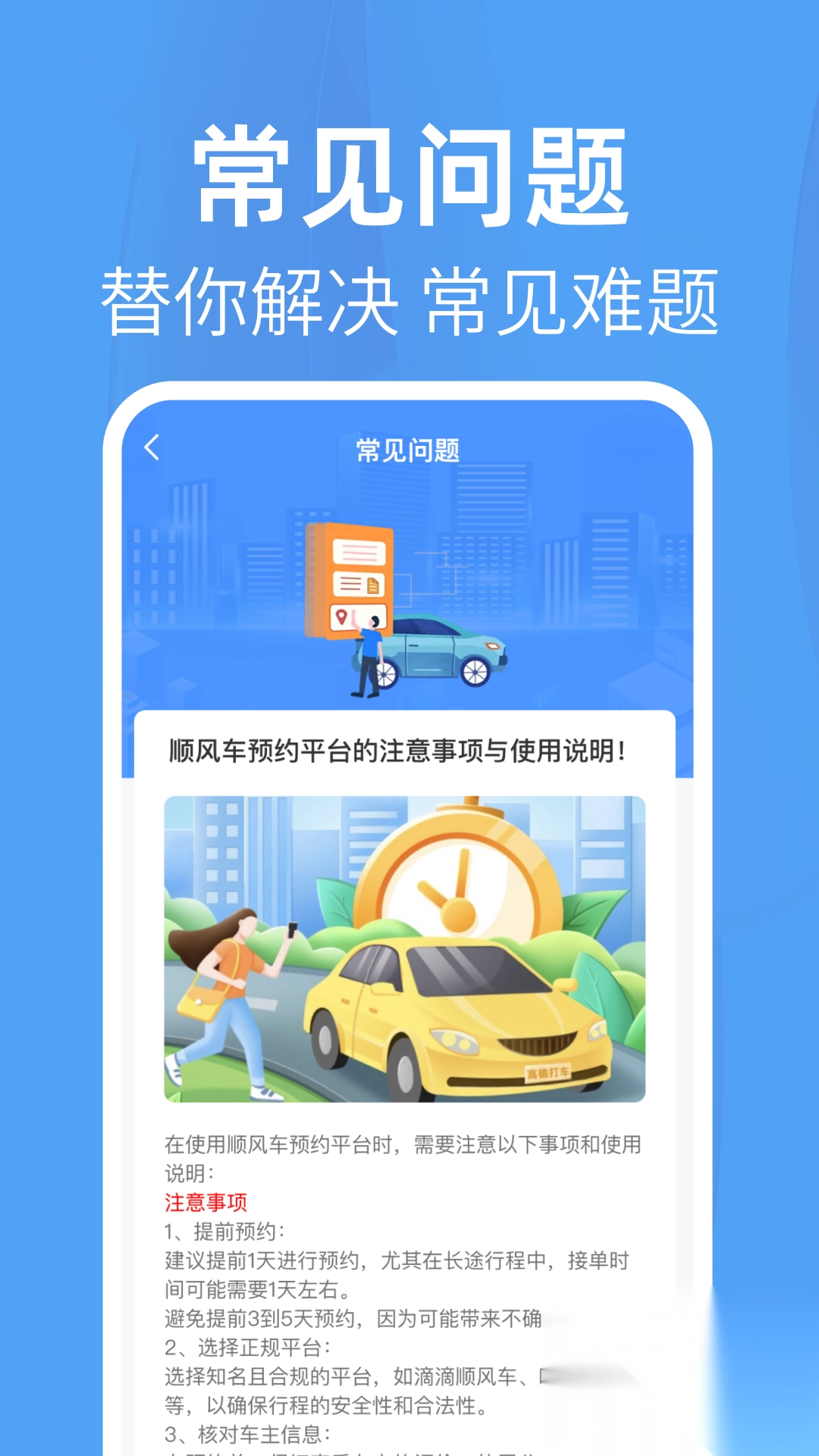 常见问题:梳理了顺风车运营过程中常常碰到的问题以及对应的解决方案。无论是注意事项,还是注册流程,您都能在此获取答案。