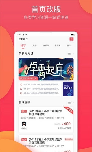 【首页】针对小初高各年级,提供语数外理化等学科专题课程,方便学生完成课前预习、课后复习,定期安排提分直播课程,名校名师一对一解答;更提供免费教育资讯及视频等,帮助家长了解教育动态。