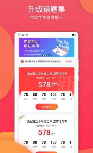 【错题集】查看学生考试成绩,各科等级位置、偏科分析、错题统计、知识点统计、失分统计等,帮您整理历次考试错题,随时随地下载练习。