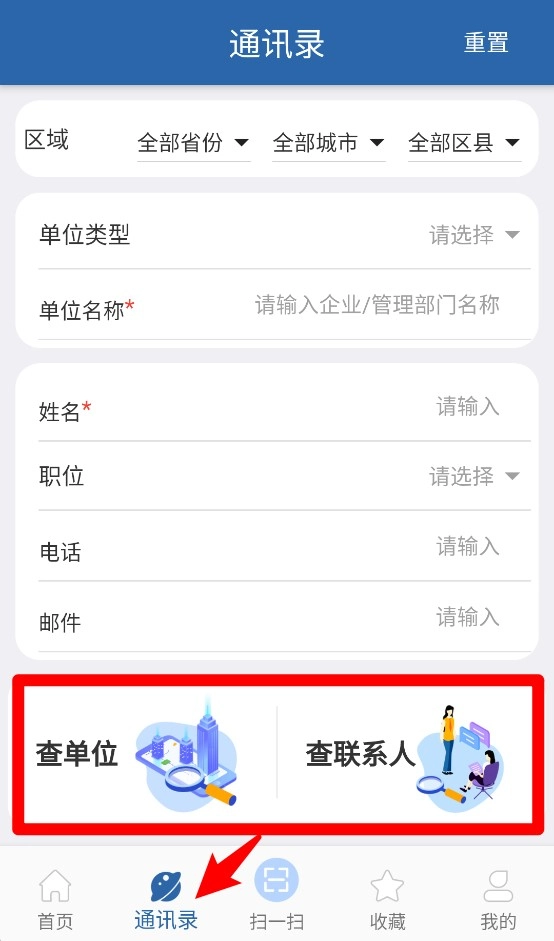 2. 当点击“通讯录”页签之后,能够依据地区、单位类型等信息,对企业或相关人员的联系方式进行查询,从而实现精准联系,方便快捷。