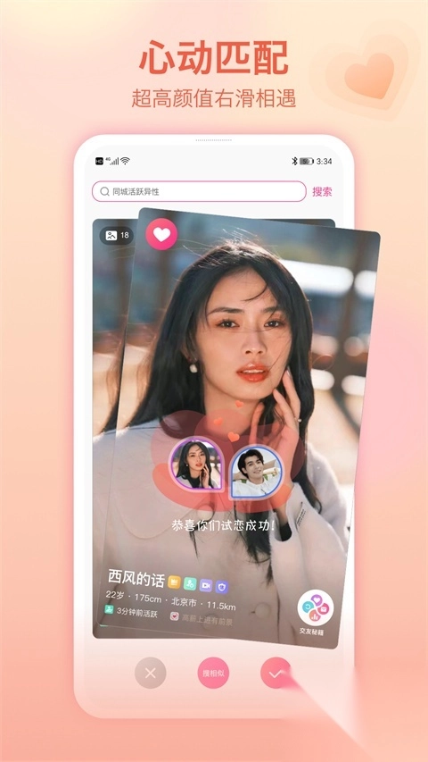 全新人脸匹配玩法:明星脸、夫妻相大揭秘;更有地图交友、擦肩而过、美拍大厅等多样模式,带来无限交友新体验