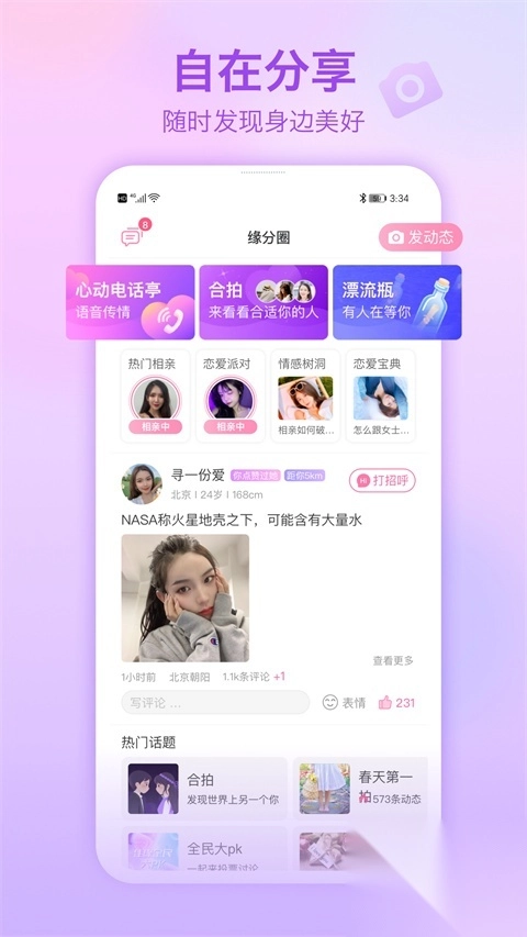 【缘分圈】发布动态遇见附近的ta,彰显你的个人风采,让你在人海中闪亮绽放