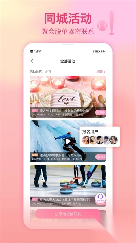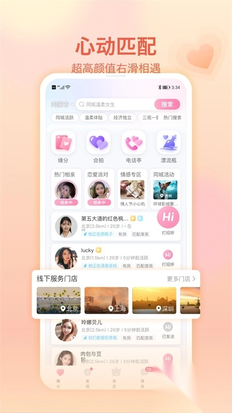 软件新增的缘分圈功能提供了一个很好的自我展示平台,让更多人可以深入的了解到你的生活状态,与你分享生活中的喜怒哀乐。通过缘分圈可以更快的建立彼此之间的了解与信任。目前每天在缘分圈约产生800万条内容,相信你未来那个Ta就在其中。