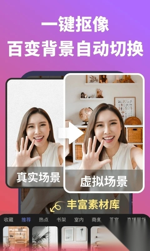 这些都不能再成为你停更的借口啦!无需绿幕即可实现实时抠像,一秒完成布景,既省时又省力还省钱。抠像精细到发丝级别,人像与背景高度融合。App内自带海量背景图,还支持自定义背景,让你想去哪拍,就能在哪拍。